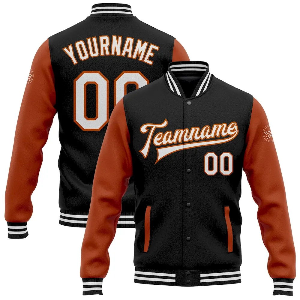 £29.99Custom Black White-Texas Orange Bomber Full-Snap Varsity Letterman Two Tone Jacket